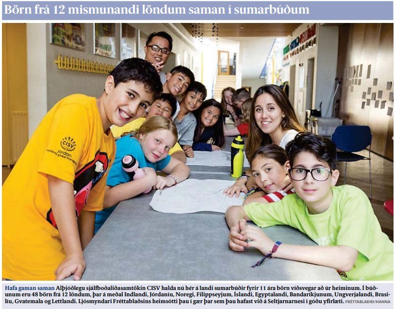 Höskuldur Kári Schram fréttarmaður Stöðvar 2 tók viðtal við Halldóru Þórdísi Jónsdóttur formann CISV á Íslandi. Þar kom fram alþjóðlegar sumarbúðir sem stofnaðar voru í Bandaríkjunum 1951 og hafa verið að mestu leyti virk hér á landi frá 1954 en af fullum krafti frá 1984. Sumarbúðirnar eru fyrir ellefu ára börn og eru á þriggja ára fresti.