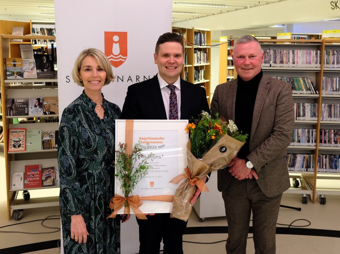 Þórdís Sigurðardóttir formaður menningarnefndar Seltjarnarness, Ari Eldjárn Bæjarlistamaður Seltjarnarness 2025 og Þór Sigurgeirsson bæjarstjóri.