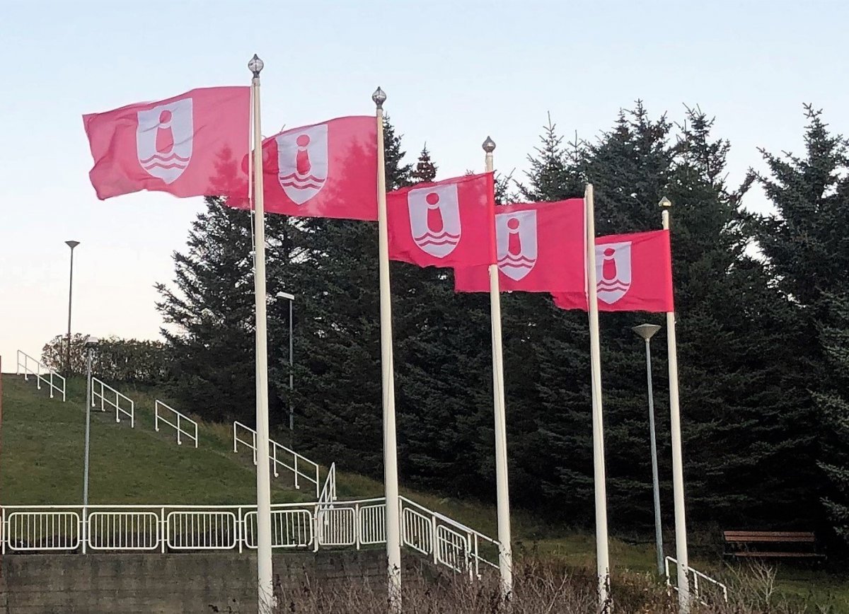 Bleikir fánar bæjarins blakta við hún og helstu kennileiti fá á sig