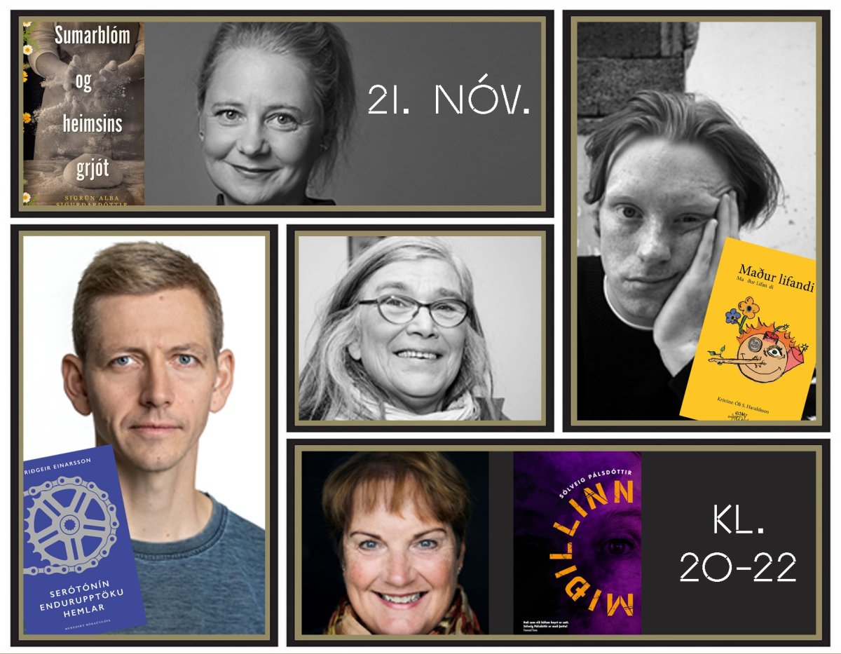 Á morgun þriðjudaginn 21. nóvember kl. 20-22 þar sem 4 rithöfundar segja frá nýútkomnum bókum sínum undir stjórn Jórunnar Sigurðardóttur bókmenntafræðings. Góð stemning, jólalegar veitingar og allir velkomnir.