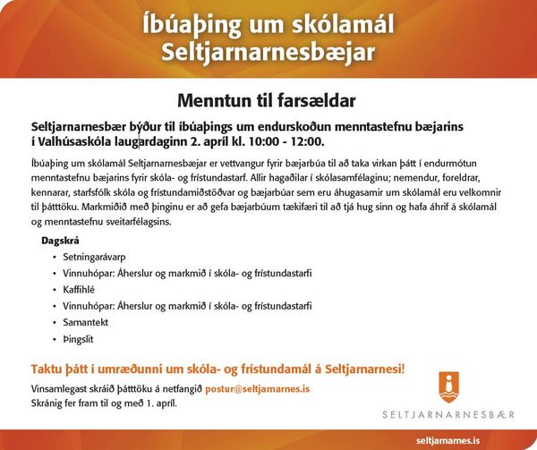 Seltjarnarnesbær býður til íbúaþings um endurskoðun menntastefnu bæjarins í Valhúsaskóla laugardaginn 2. apríl kl. 10:00 - 12:00. Skráning fer fram með tölvupósti á postur@seltjarnarnes.is
