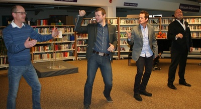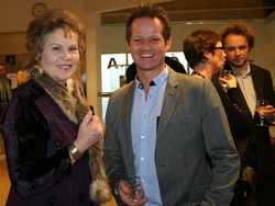 Jóhann með móður sinni Guðlaugu Ingibergsdóttur og fyrir neðan er hann að spjalla við Margréti Helgu Jóhannsdóttur fyrrum bæjarlistamann. Á neðstu myndinni eru félagar hans í sýningunni Alvöru menn sem tóku með honum lagið og Pálmi Sigurhjartarson lék með þeim á píanó.