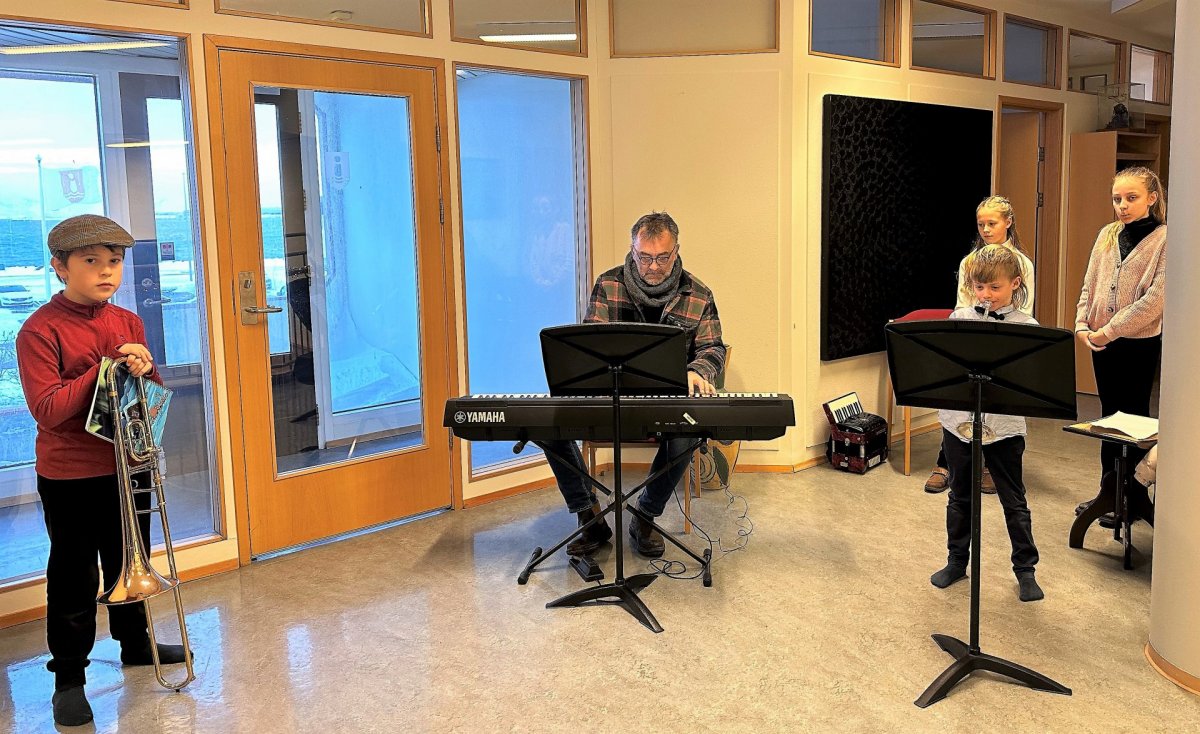 Það komust allir í hátíðarskap á bæjarskrifstofunni þegar þau Amelia, Barbara, Sólveig, Arney, Emil, Jónatan, Eyrún og Elía nemendur í tónlistarskólanum komu og léku sígild jólalög fyrir starfsmenn. Hópurinn var þá að koma beint frá Seltjörn hjúkrunarheimilinu þar sem að þau spiluðu og glöddu íbúana þar. Frá bæjarskrifstofunni lá leiðin á Skólabrautina til að spila jólalög á aðventustund félagsstarfs aldraðra sem þá var fullum gangi. Krakkarnir stóðu sig frábærlega í jólalögunum öllum til mikillar gleði. Áður en þau kvöddu prófuðu þau auðvitað bæjarstjórastólinn og duttu strax í bæjarstjóragírinn við tölvuna eins og sjá má. Takk fyrir komuna og tónlistina!