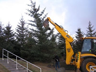 Tvö trjánna koma úr einkagörðum á Nesinu og tvö voru ræktuð í Plútóbrekkunni fyrir utan bæjarskrifstofurnar. Má því með sanni segja að ræktaður hafi verið nytjaskógur á Seltjarnarnesi sem mörgum hefði þótt harla ólíklegt fyrir 15 árum. Þörf var á grisjun í Plútóbrekku og því voru trén nýtt til að prýða bæinn yfir jólahátíðina. Myndin sýnir eitt trjánna fjarlægt af starfsmönnum bæjarins.