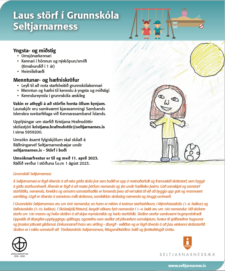 Ráða á í þrjár stöður kennara á yngsta- og miðstigi: Umsjónarkennari, Heimilisfræði og hönnun og nýsköpun/smíði. Umsóknarfrestur er til og með 11. apríl 2023.