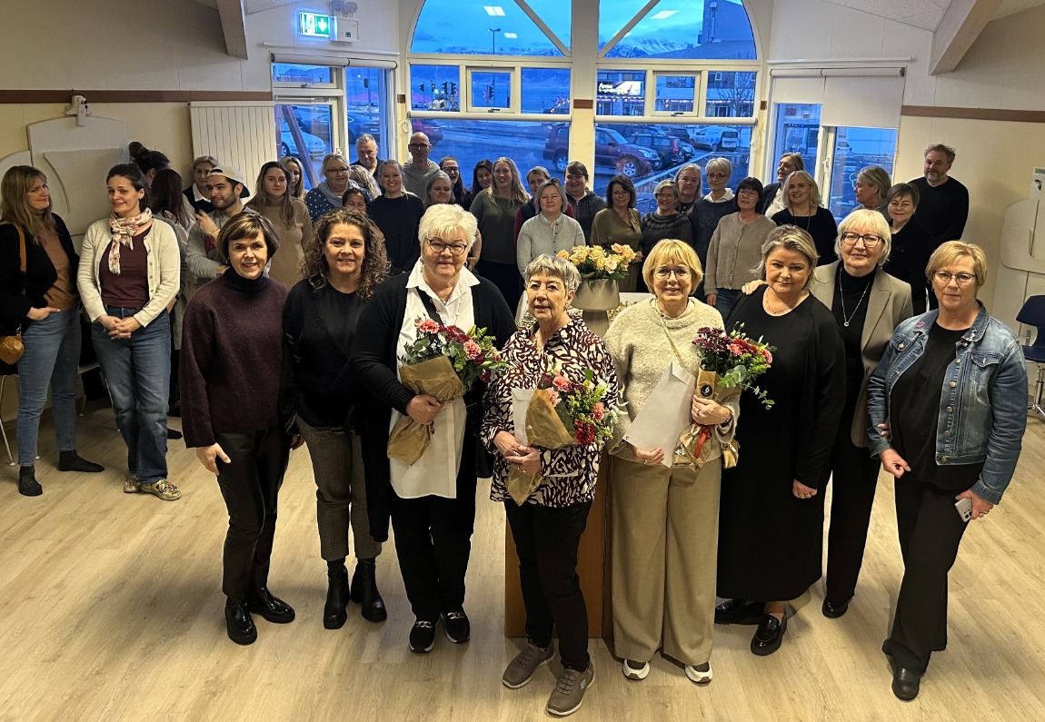Margrét veitti þeim Önnu, Örnu og Þórdísi blóm og viðurkenningarskjöl venju samkvæmt þegar að starfsfólk Seltjarnarnesbæjar hættir eftir langan starfsaldur. Kveðjuathöfnin fór fram í hátiðarsalnum á Mánabrekku þar sem boðið var upp á kaffiveitingar þar sem fjöldi starfsmanna safnaðist saman auk nokkurra gesta m.a. bæjarstjóri og tveir fyrrum leikskólastjórar, þær Anna Harðardóttir og Soffía Guðmundsdóttir sem lengi unnu með þeim stöllum.