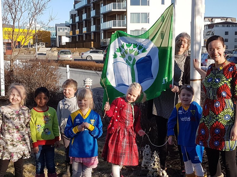 Nemendur og starfsfólk Leikskóla Seltjarnarness fengu á dögunum afhentan nýjan Grænfána í fjórða sinn, en þess má geta að Mánabrekka hafði áður fengið fánann þrisvar sinnum frá árinu 2004 þannig að þetta er í sjöunda skipti sem skólinn fagnar af þessu tilefni. Caitlin Wilson, verkefnastjóri fyrir Skóla á grænni grein, afhenti fánann og viðurkenningu til leikskólans við hátíðlega athöfn. Börn og starfsfólk fögnuðu þessum áfanga með söng, þar sem lagatextar fjölluðu um nátúruna og umhverfi okkar. Nemendur af Ási og Bakka leiddu sönginn undir stjórn Sesselju Kristjánsdóttur.