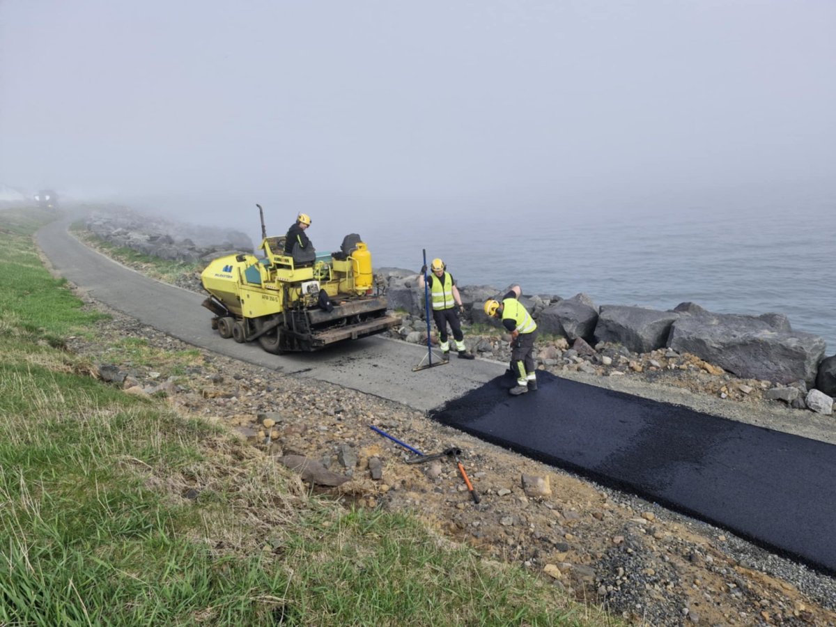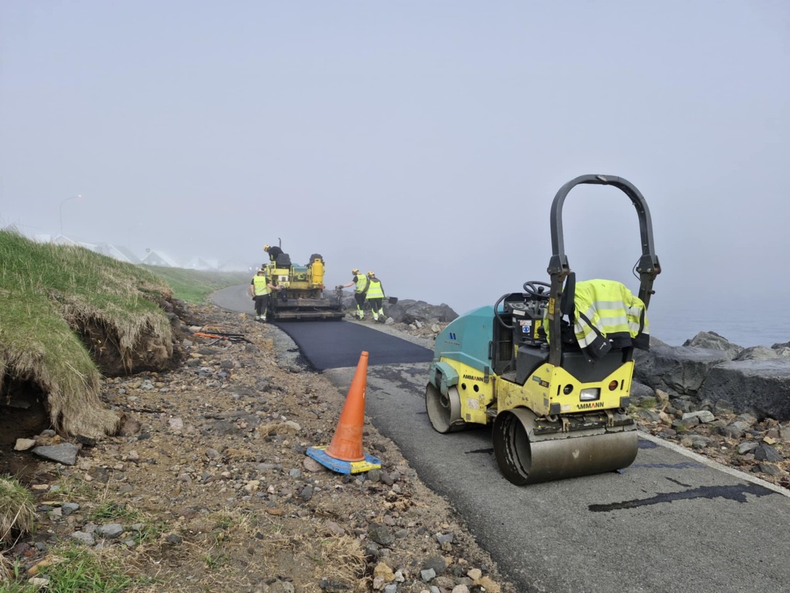 Í síðustu viku var byrjað að malbika yfir skemmdirnar í strandstígnum eftir óveðrið í mars og sér því loks bráðum fyrir endann á viðgerðunum sem hafa staðið yfir síðan óveðrið skall á með hárri sjávarstöðu og mikilli ölduhæð.