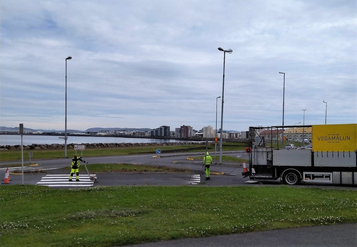 Þessa dagana er unnið að því að mála merkingar á götur bæjarins sbr gangbrautir, þríhyrninga við biðskyldur og miðlínur sem aðgreinir akstursstefnuna. Fyrirtækið GSG ehf. annast verkið sem mun ljúka í haust.