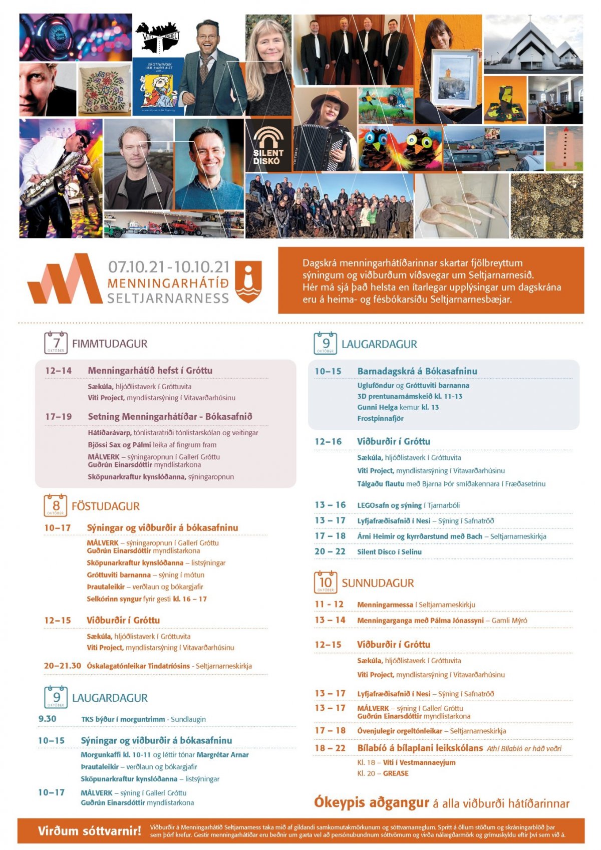 Menningarhátíð Seltjarnarness 2021 er hafin og dagskráin er stútfull af fjölbreyttum viðburðum og sýningum fyrir alla aldurshópa. Ekki missa af - hér má sjá yfirlit yfir dagskránna: