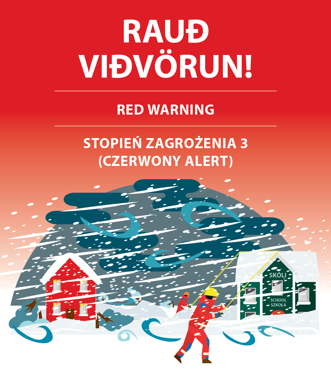 RAUÐ VEÐURVIÐVÖRUN, RED WEATHER WARNING, CZERWONY ALERT