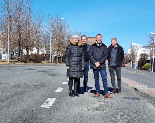 Á myndunum má sjá Ásgerði Halldórsdóttur bæjarstjóra, Ásberg K. Ingólfsson framkvæmdastjóra Malbikunarstöðvarinnar Höfða, Pétur Vilberg Guðnason hjá Strendingi og Brynjar Þór Jónasson sviðsstjóra Skipulags- og umhverfissviðs en þau fóru á framkvæmdastað í kjölfar undirritunar samningsins.