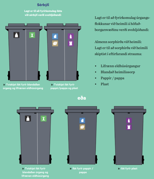 Kerfið er í samræmi við þær breytingar sem taka gildi á lögum um söfnun á úrgangi við heimili um áramótin og er að Norrænni fyrirmynd. Við tillögugerð að hönnun kerfisins var haft að leiðarljósi að breytingarnar verði eins þægilegar og einfaldar fyrir íbúa og mögulegt er og verða tvískiptar tunnur í boði við heimili þar sem pláss er af skornum skammti. Þegar um tvískiptar tunnur er að ræða verður lífrænum eldhúsúrgangi og blönduðum úrgangi safnað í sitthvort hólfið í sömu tunnunni og plastumbúðum annars vegar og pappír og pappa hins vegar verður safnað í aðra tvískipta tunnu.
