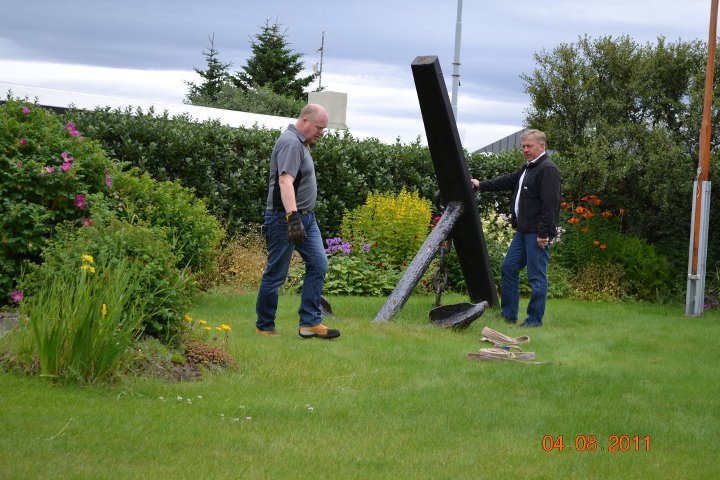 Steinunn Árnadóttir og Hreinn Sigurjónsson, við hlið akkerisins – komið á