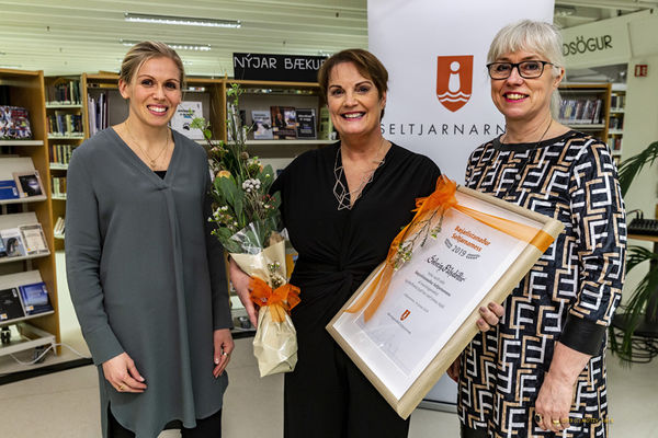 Guðrún Jónsdóttir formaður menningarnefndar, Sólveig Pálsdóttir rithöfundur og bæjarlistamaður 2019 og Ásgerður Halldórsdóttir bæjarstjóri.