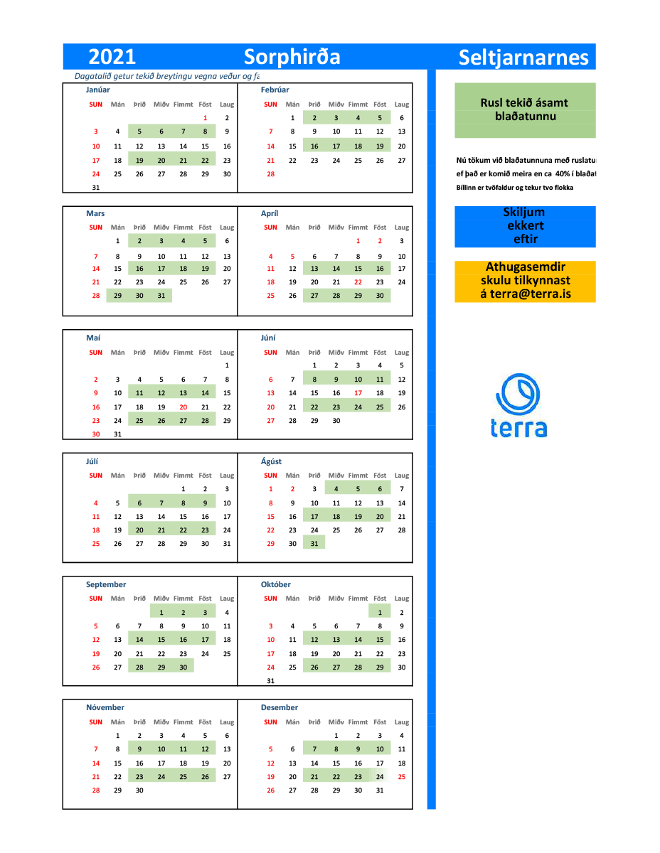 Hér má sjá sorphirðudagatal ársins 2021 en dagsetningar sorphirðu er jú sameiginlegt áhugamál flestra bæjarbúa. Á nýju ári býður Terra upp á þá nýbreytni og auknu þjónustu að blaðatunnur verða ávallt teknar með almenna sorpinu ef það er komið uþb 40% eða meira í tunnuna.