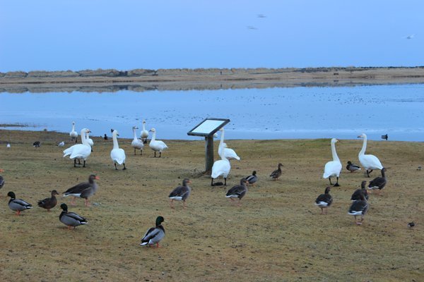 Svandís er með eindæmum vanaföst en hún er talin hafa verpt í hólmanum í Bakkatjörn í 18 ár. Það voru greinilega fagnaðarfundir þegar Svandís sneri aftur á tjörnina í gær því þar var hún í faðmi stórfjölskyldunnar, mátti þar sjá stegginn, ungana þrjá sem komust upp síðasta sumar og önnur eldri afkvæmi að talið er.