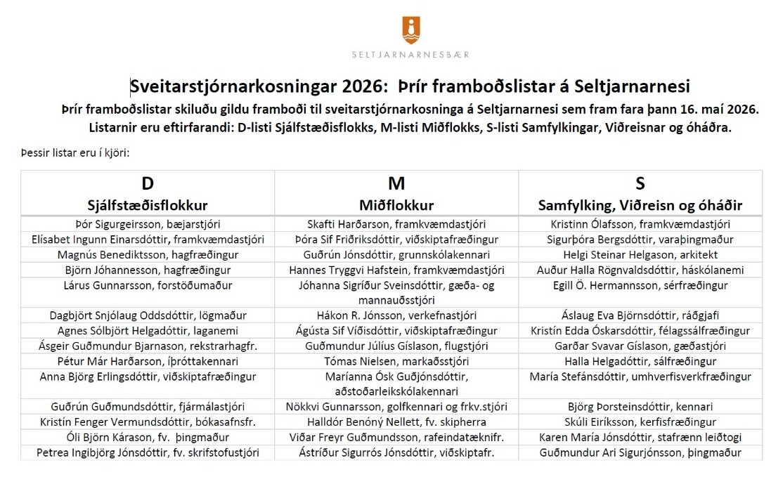 Þrír framboðslistar skiluðu gildu framboði til sveitarstjórnarkosninga á Seltjarnarnesi sem fram fara þann 16. mai 2026. Listarnir eru eftirfarandi: D-listi Sjálfstæðisflokks, M-listi Miðflokks og S-listi Samfylkingar, Viðreisnar og óháðra.