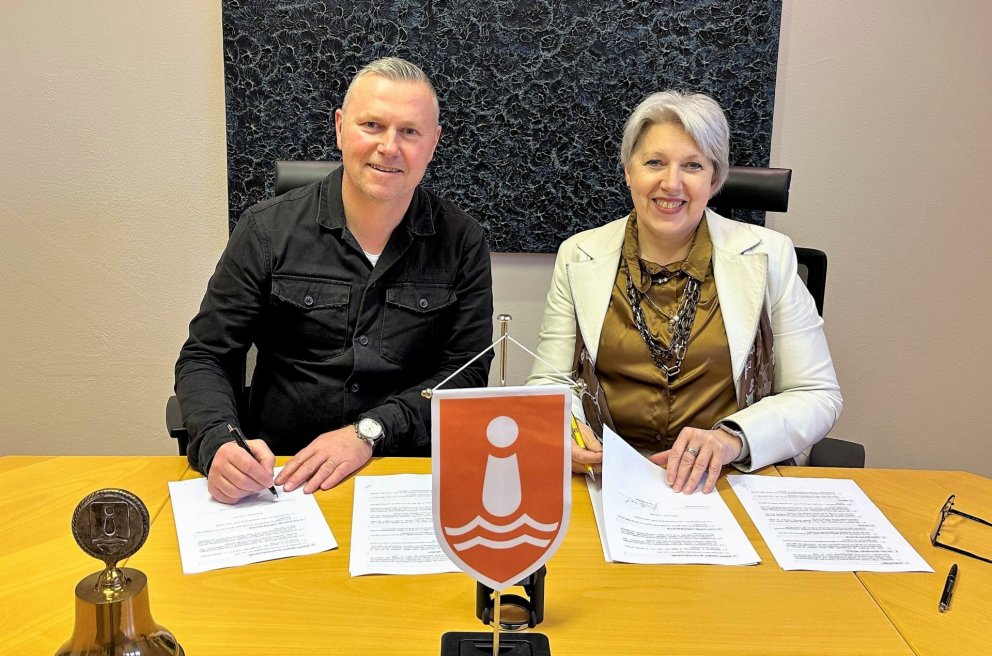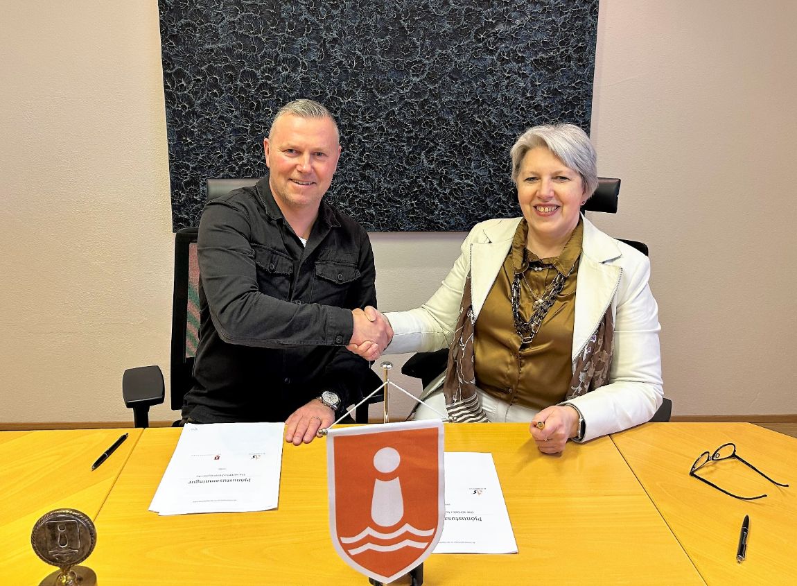 Þór og Þóra handsala þjónustusamninginn á milli Seltjarnarnesbæjar og Ás styrktarfélags.