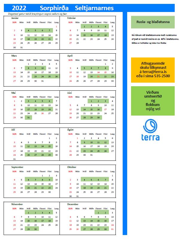 Terra reyndist nauðsynlegt að uppfæra sorphirðudagtal aftur til að ná að koma öllu á rétt ról eftir áhrif veðursins undanfarið. Hér má sjá hvernig dagatal ársins 2022 lítur nú út.