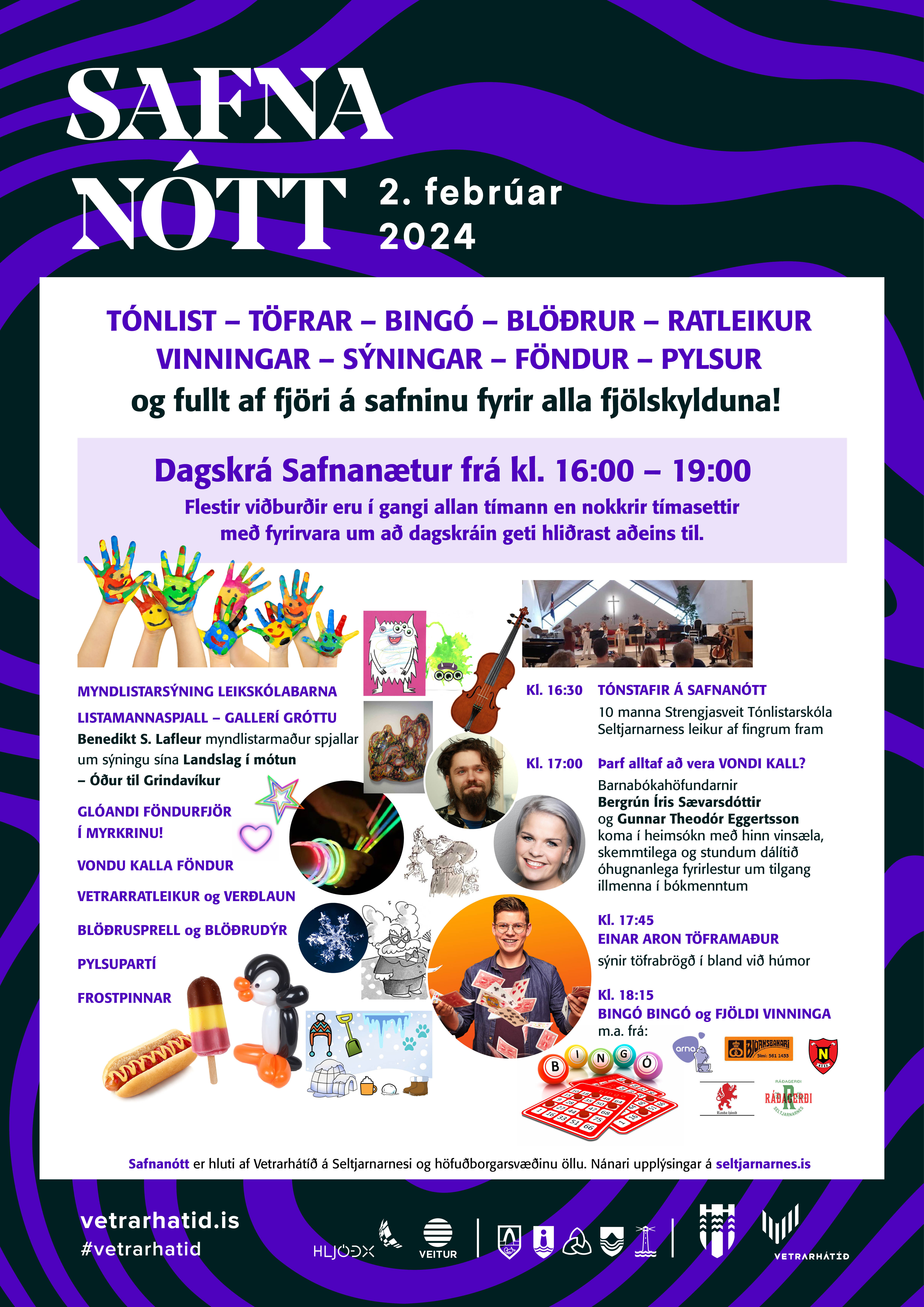 Vetrarhátíð hófst í dag - norðurljósagrænn litur lýsir upp Gróttuvita og kirkjuþakið, stemning á Sundlauganótt í kvöld og á morgun verður fjörug dagskrá á Safnanótt bókasafnsins. Ókeypis aðgangur og allir velkomnir!