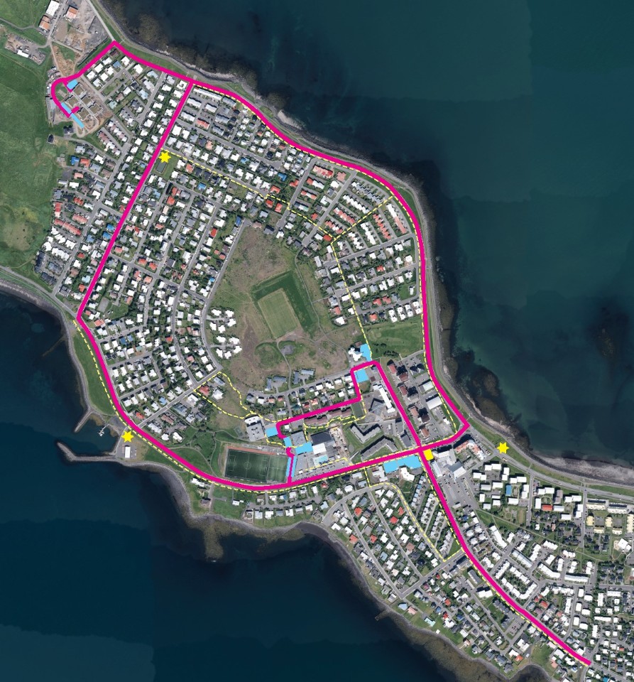 Á myndinni hér að neðan má sjá forgangsmokstur en mokstri á þeim leiðum á að vera lokið fyrir kl. 07:30 á morgnanna. Til upplýsinga þá merkja línurnar; bleikar línur tákna akbrautir, gular punktalínur eru gangstígar og bláir fletir sýna bílaplön.