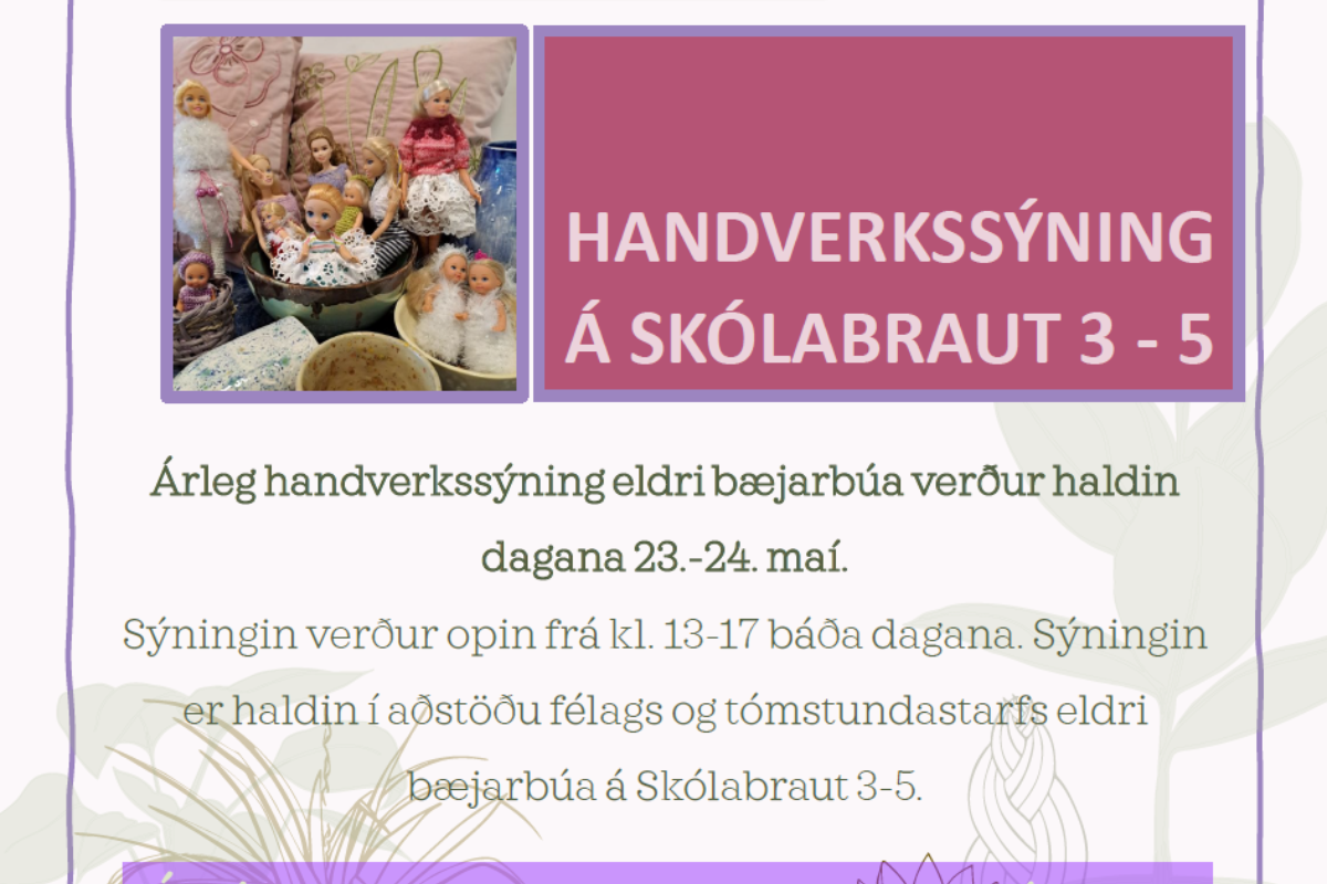 Hin árlega handverkssýning eldri bæjarbúa verður haldin í aðstöðu félags- og tómstundastarfsins á Skólabraut 3-5 frá kl. 13-17, laugardaginn 23. maí og sunnudaginn 24. maí nk. Bæjarbúar eru eindregið hvattir til að mæta og skoða afrakstur vetursins. Á sýningunni verður sölubás og hægt að fá sér ilmandi vöfflur og kaffi.