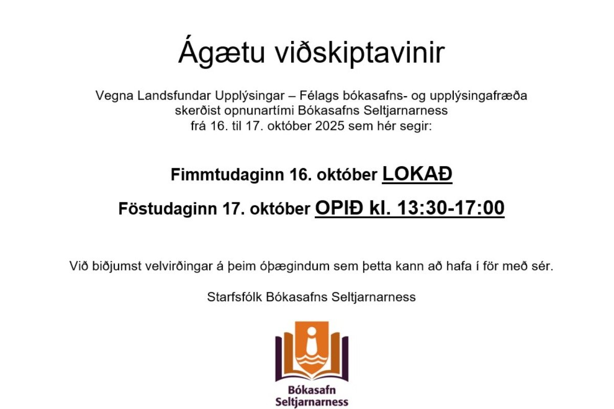 Vegna Landsfundar Upplýsingar skerðist opnunartími Bókasafns Seltjarnarness