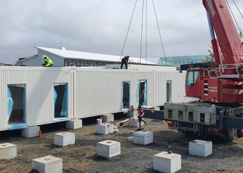 Unnið er að því að reisa nýjar færanlegar einingar fyrir Leikskóla Seltjarnarness á lóðinni Skólabraut 1 í tengslum við fyrirhugaða byggingu á nýjum leikskóla.