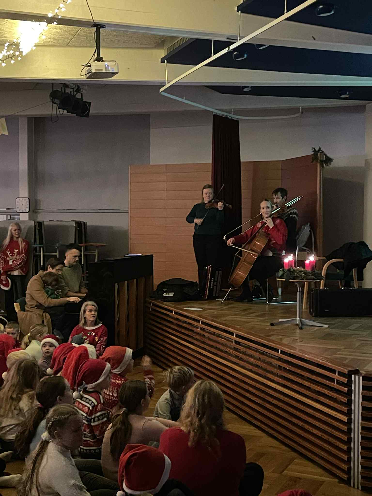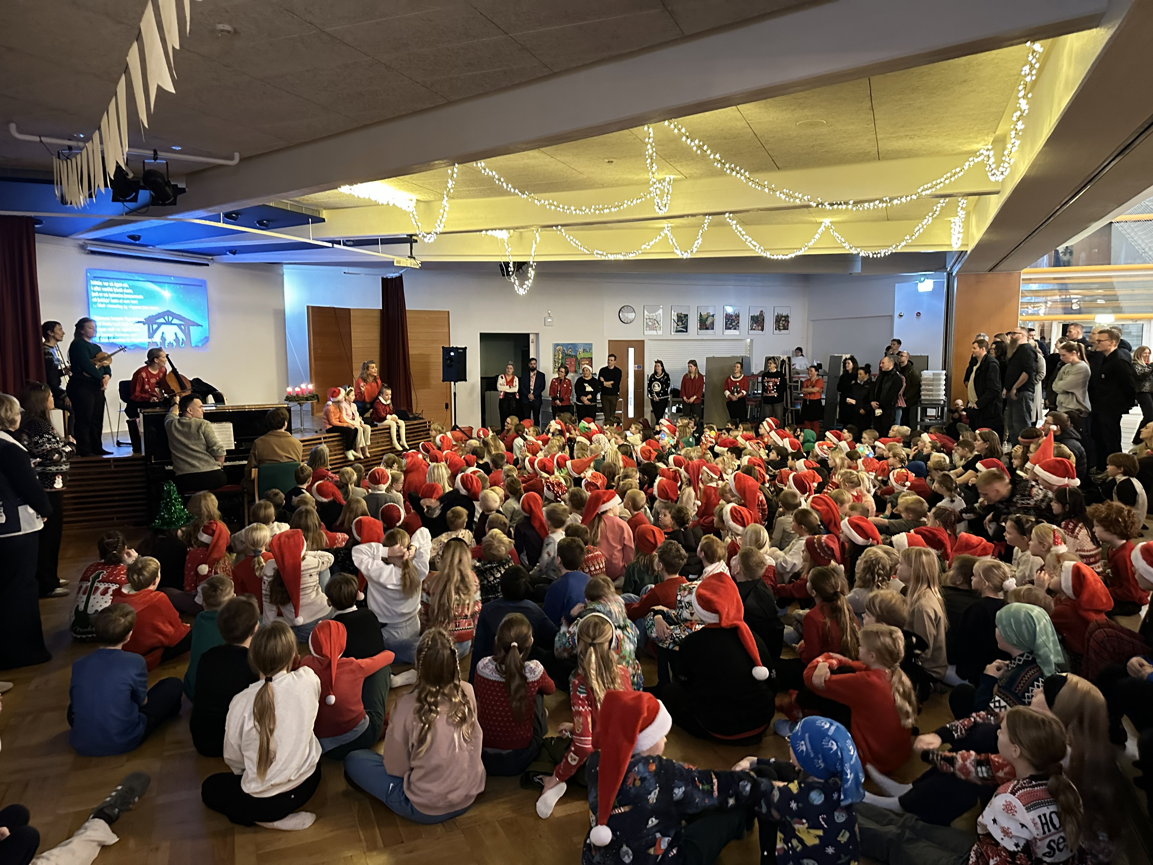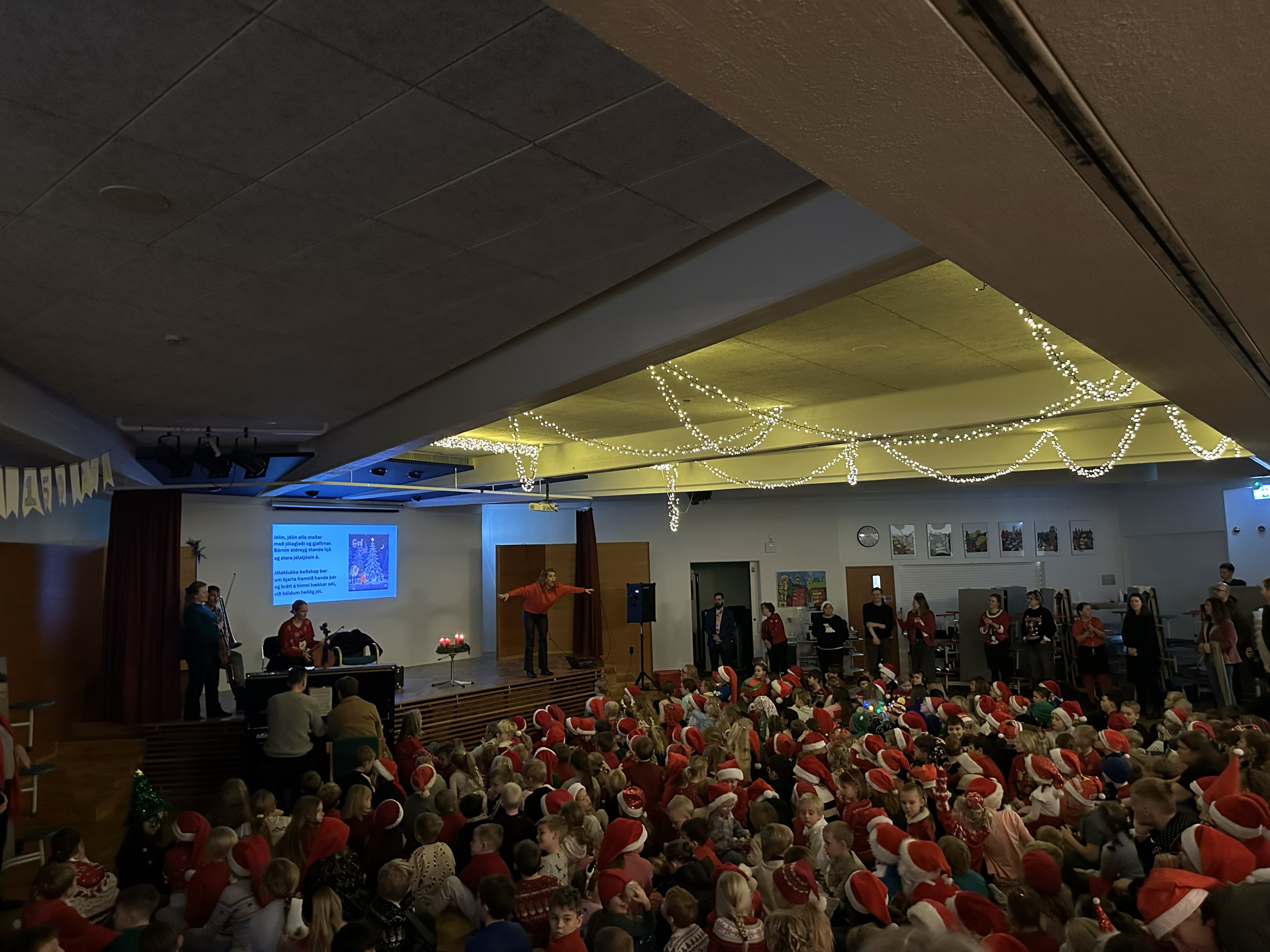 Þetta var hátíðleg stund þar sem jólaandinn sveif yfir vötnum. Nokkrir foreldrar sáu um undirleik fyrir okkur, sem gerði þetta enn hátíðlegra. Þá var tekið forskot á sæluna og kveikt á öllum fjórum kertunum á aðventukransinum okkar. Fyrir þá sem ekki voru komnir í jólaskap hlýtur þessi samsöngur að hafa snarbreytt því.