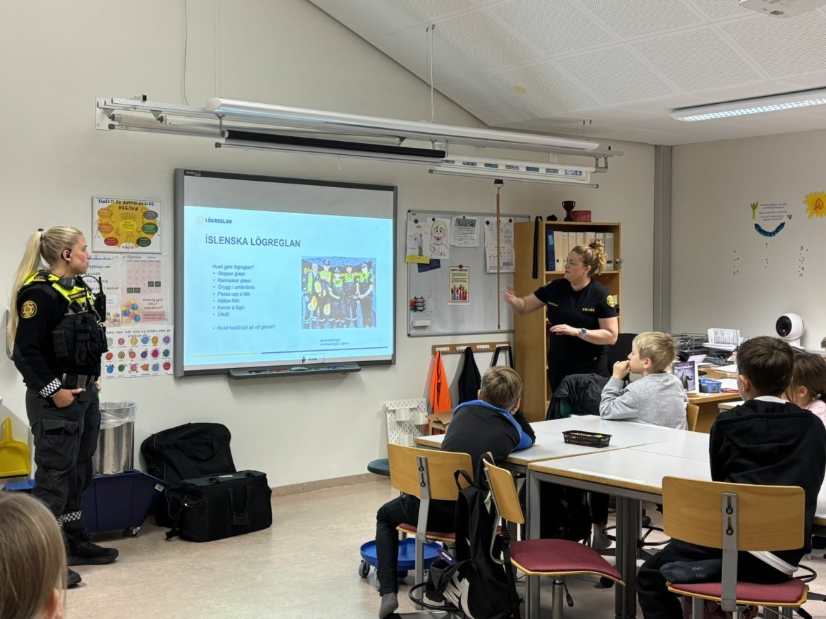 Í heimsókninni ræddu þær við nemendur um samskipti og líðan og um umferðaröryggi, meðal annars um umferðarljósin og hjólahjálma. Þær sögðu einnig frá starfi lögreglunnar og svöruðu fjölmörgum spurningum nemenda, sem sýndu mikinn áhuga – sérstaklega á því hvernig lögreglan tekst á við glæpi og nær bófum.