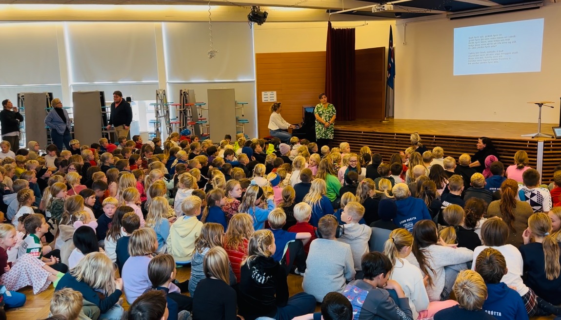 Vikulegur samsöngur á sal er nýjung í skólastarfi Mýrarhúsaskóla.