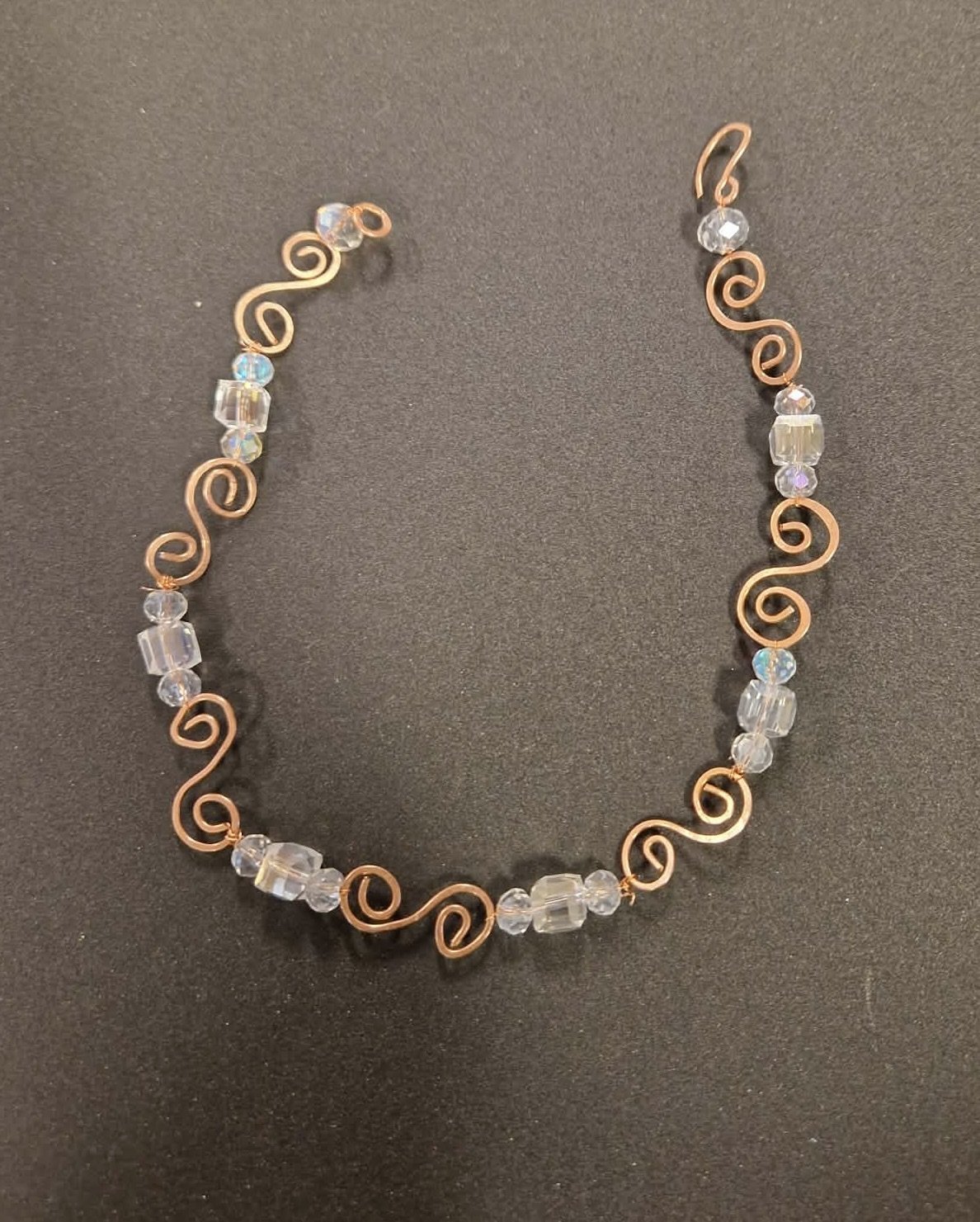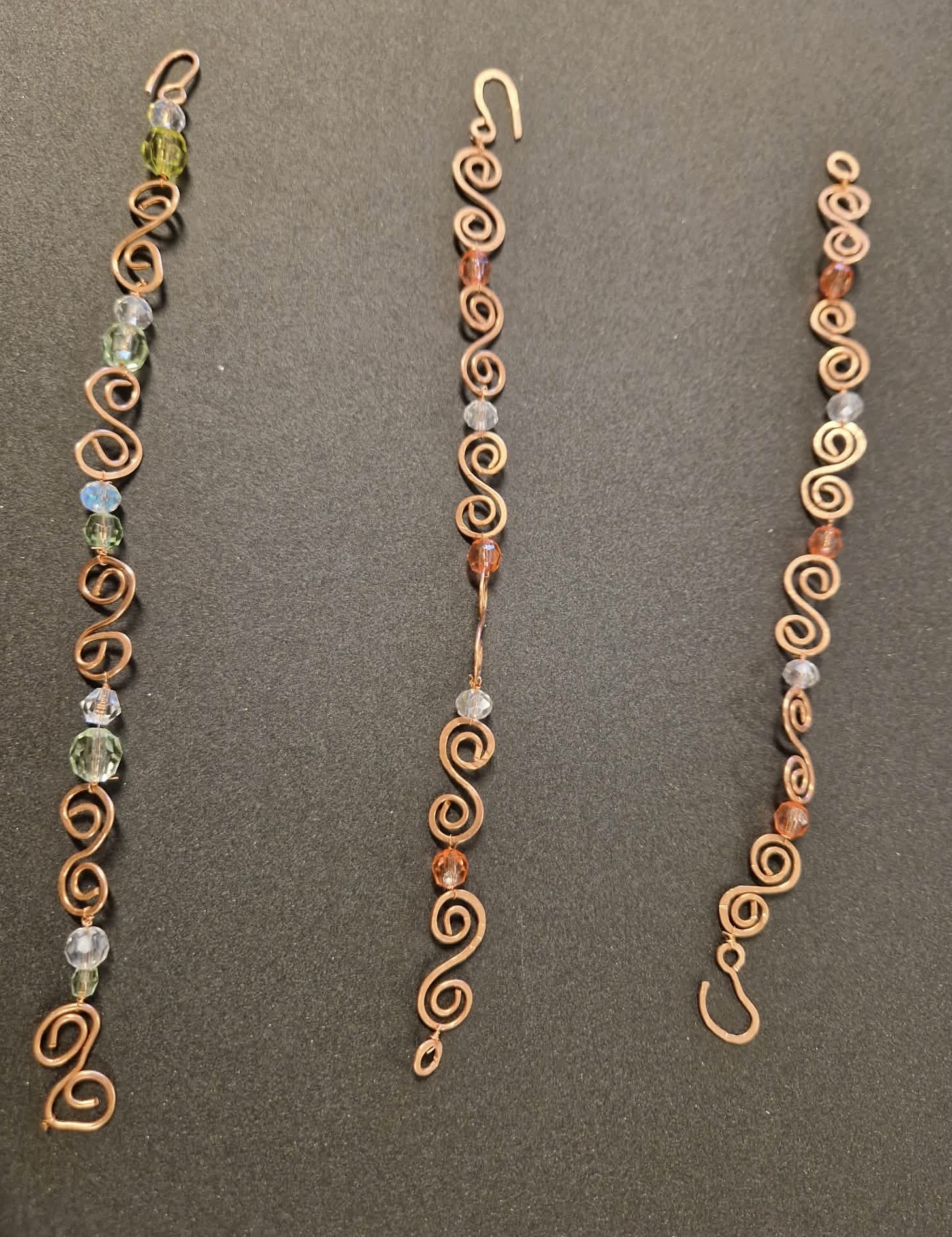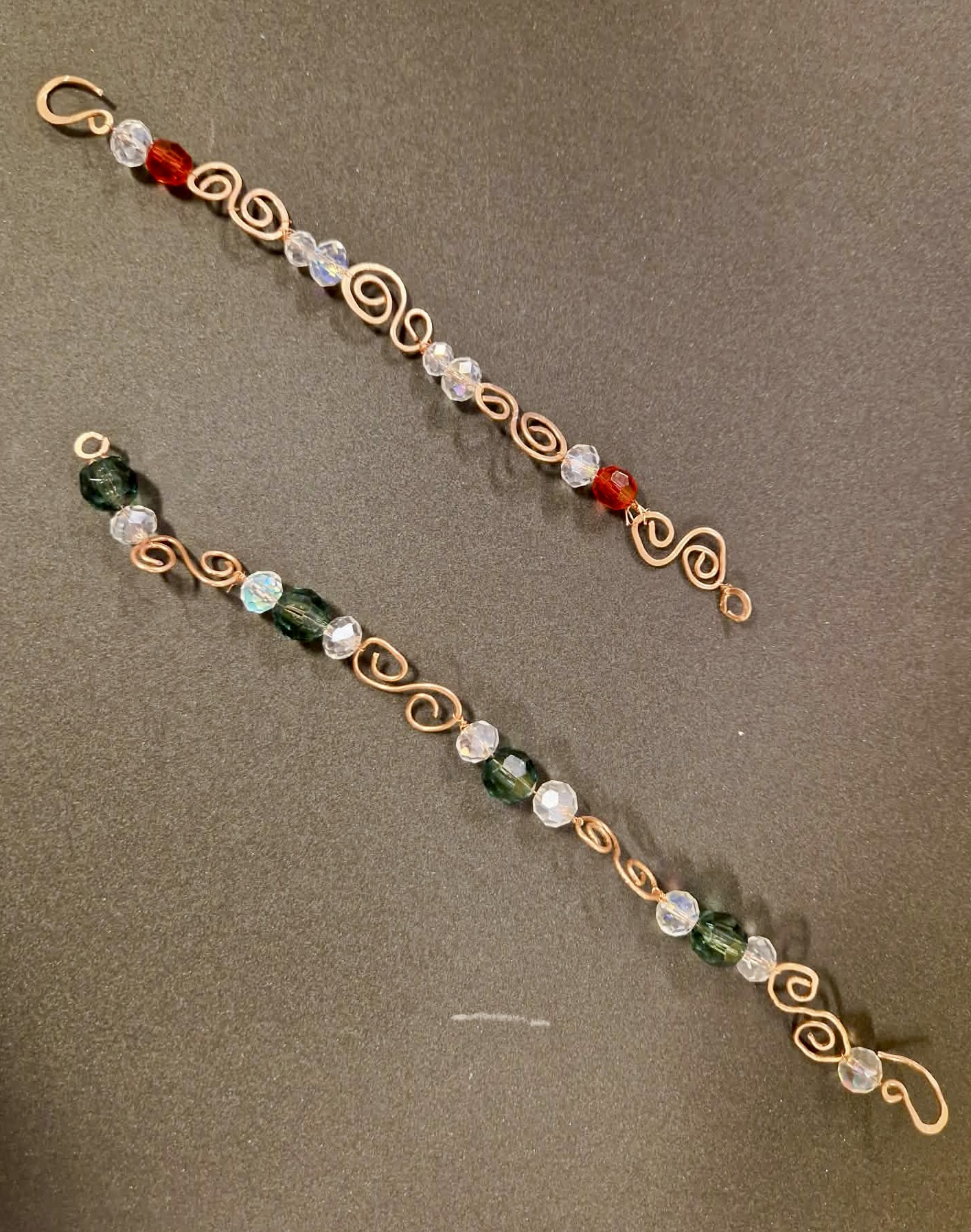 Gripirnir eru handgerðir úr kopar og kristalperlum, þar sem hluti koparvírsins var endurnýttur úr gömlum rafmagnsvírum.