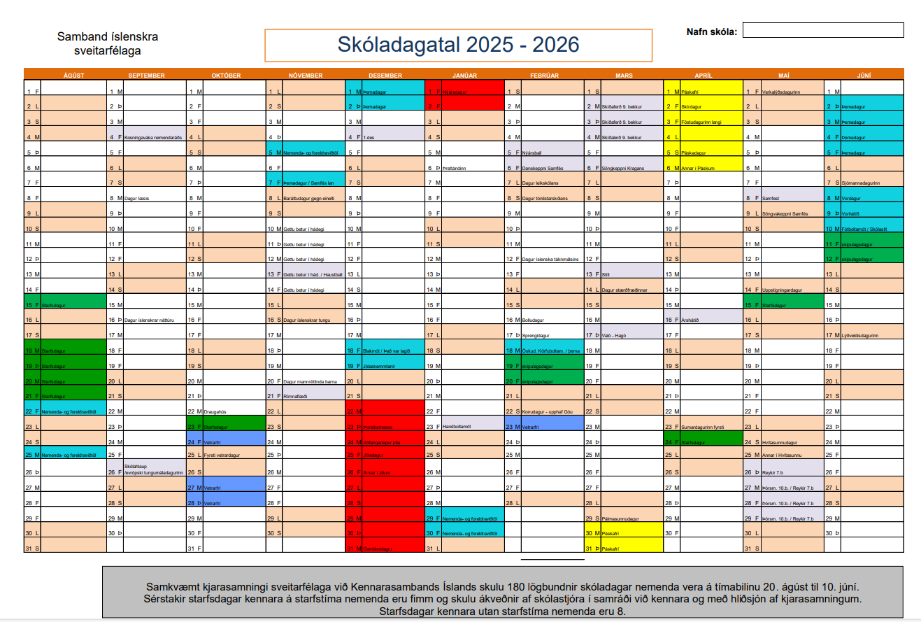 Lögum samkvæmt skulu skóladagar nemenda vera 180 á tímabilinu 20. ágúst -10. júní. Starfsdagar kennara utan starfstíma nemenda eru 8.