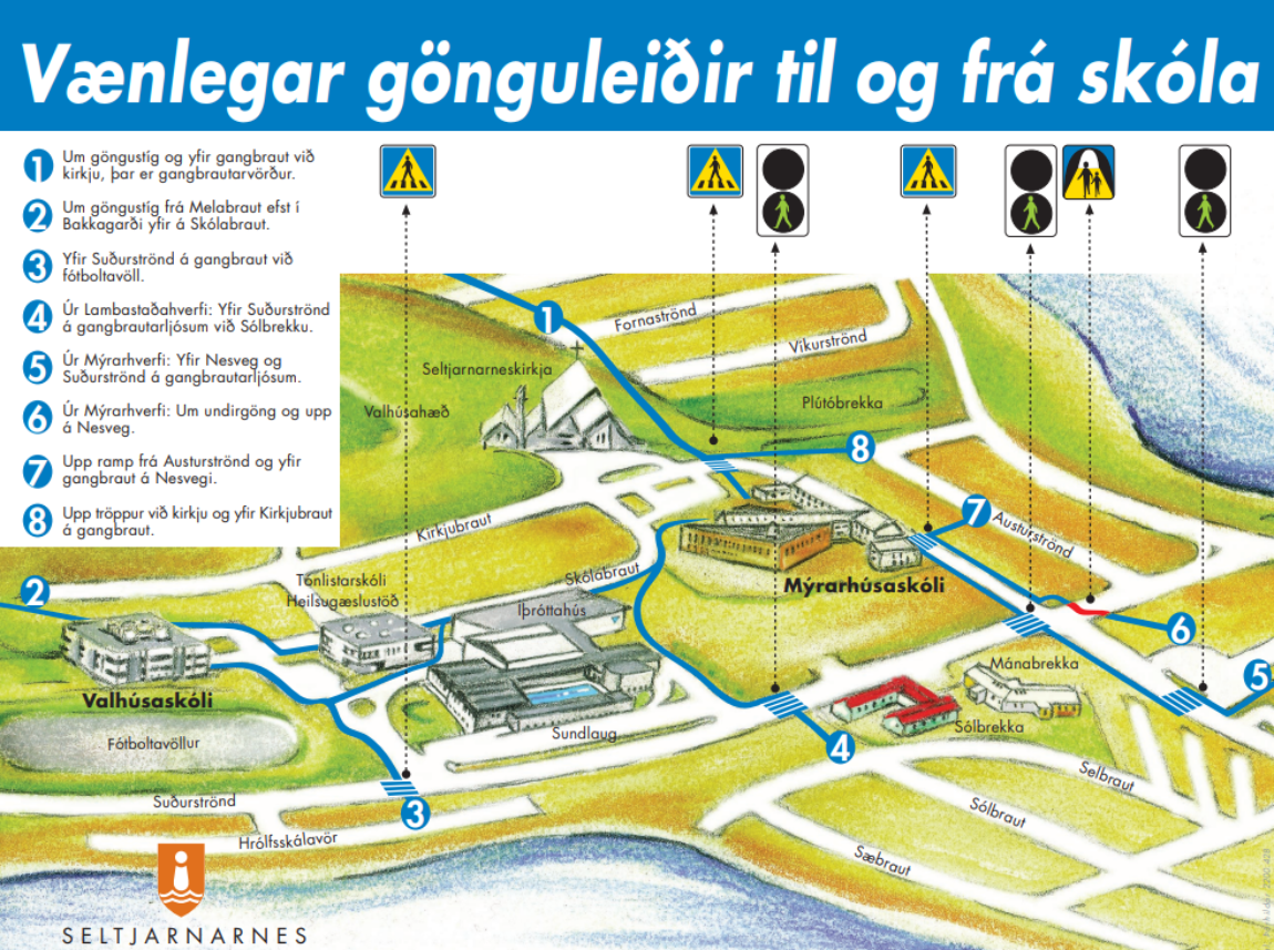 Myndin sýnir kort með vænlegum gönguleiðum til og frá skóla. Foreldrum er enn fremur bent á hringaksturinn við heilsugæsluna en þaðan er öruggur göngustígur upp að skólahúsinu. Með þessu móti minnkar umferð bíla við skólahúsin og öryggi allra eykst.